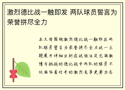 本文将围绕“激烈德比战一触即发,两队球员誓言为荣誉拼尽全力”这一主题展开详细分析。在这场注定充满激情与挑战的德比战中,两队的球员不仅面临着对手的激烈竞争,更要为各自的荣誉和球队的未来拼尽全力。本文将从...