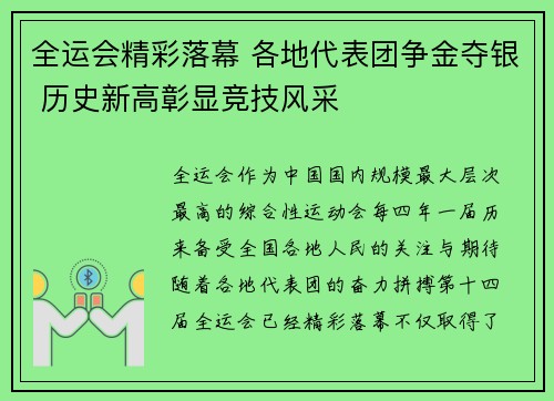 全运会作为中国国内规模最大、层次最高的综合性运动会,每四年一届,历来备受全国各地人民的关注与期待。随着各地代表团的奋力拼搏,第十四届全运会已经精彩落幕,不仅取得了创历史新高的成绩,还充分展示了各地代表...