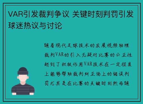 随着视频助理裁判(VAR)技术的普及,足球比赛中的裁判判罚争议变得愈加显眼,尤其在关键比赛时刻,裁判的判罚经常引发球员和球迷的不满。尽管VAR旨在减少人为错误,但它也带来了新的问题,尤其是裁判在面对技...