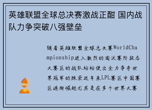 随着英雄联盟全球总决赛(World Championship)进入激烈的淘汰赛阶段,各大赛区的战队纷纷使出全力,争夺世界冠军的殊荣。近年来,LPL赛区(中国赛区)逐渐崛起,尤其是在多个世界大赛中表现突...