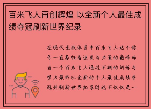 在现代竞技体育中,百米飞人这个称号一直象征着速度与力量的巅峰。而当一个百米飞人通过不断的训练与努力,最终以全新的个人最佳成绩夺冠并刷新世界纪录时,这不仅仅是一项个人成就的体现,更是对人类潜能的极限挑战...