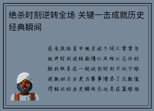 在竞技体育中,“绝杀”这个词汇常常与经典时刻、逆转剧情以及难以忘怀的胜利联系在一起。这些时刻不仅令球迷激动万分,更为赛事增添了无数值得铭记的历史瞬间。无论是在篮球场上,足球场上,还是其他各种竞技项目中...