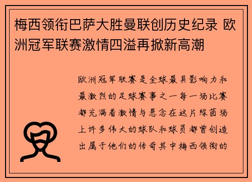 欧洲冠军联赛是全球最具影响力和最激烈的足球赛事之一,每一场比赛都充满着激情与悬念。在这片绿茵场上,许多伟大的球队和球员都曾创造出属于他们的传奇,其中,梅西领衔的巴塞罗那队更是无数球迷心中的神话。在欧洲...