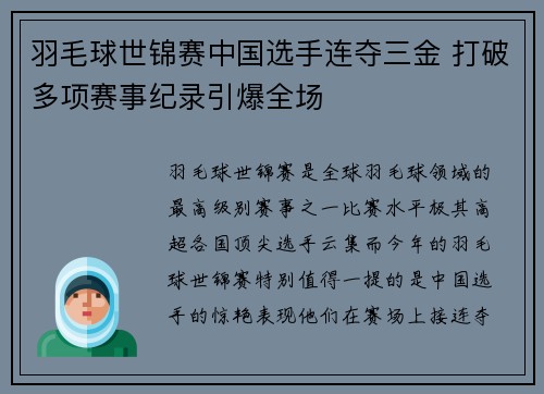 羽毛球世锦赛是全球羽毛球领域的最高级别赛事之一,比赛水平极其高超,各国顶尖选手云集。而今年的羽毛球世锦赛,特别值得一提的是中国选手的惊艳表现,他们在赛场上接连夺得三枚金牌,打破多项赛事纪录,激起了全场...