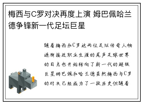 随着梅西和C罗这两位足坛传奇人物逐渐接近职业生涯的尾声,足球世界的目光也开始转向了新一代的超级巨星——姆巴佩和哈兰德。虽然梅西与C罗的对决已经成为了一段历史,但随着全球足球水平不断提高,这两位前辈的光...