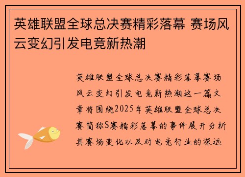 《英雄联盟全球总决赛精彩落幕,赛场风云变幻引发电竞新热潮》这一篇文章将围绕2025年英雄联盟全球总决赛(简称S赛)精彩落幕的事件展开,分析其赛场变化以及对电竞行业的深远影响。作为全球最具影响力的电子竞...