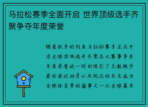 随着秋季的到来,马拉松赛季正式开启,全球顶级选手齐聚各大赛事,争夺年度荣誉。这一时刻吸引了无数跑步爱好者、运动员以及观众的目光,成为全球体育界的盛事之一。从全球最具影响力的赛事到赛季期间的重点较量,马...