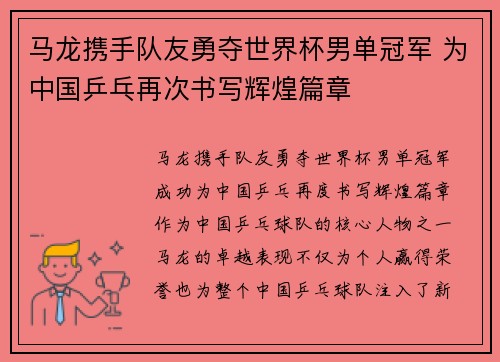 马龙携手队友勇夺世界杯男单冠军,成功为中国乒乓再度书写辉煌篇章。作为中国乒乓球队的核心人物之一,马龙的卓越表现不仅为个人赢得荣誉,也为整个中国乒乓球队注入了新的力量。中国乒乓球一直以来是世界乒坛的领军...