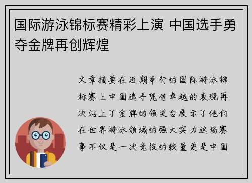 文章摘要:在近期举行的国际游泳锦标赛上,中国选手凭借卓越的表现,再次站上了金牌的领奖台,展示了他们在世界游泳领域的强大实力。这场赛事不仅是一次竞技的较量,更是中国游泳发展历程中的一大亮点。随着比赛的精...