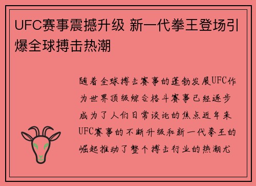 随着全球搏击赛事的蓬勃发展,UFC作为世界顶级综合格斗赛事,已经逐步成为了人们日常谈论的焦点。近年来,UFC赛事的不断升级和新一代拳王的崛起,推动了整个搏击行业的热潮,尤其是在全球观众对比赛的关注度和...