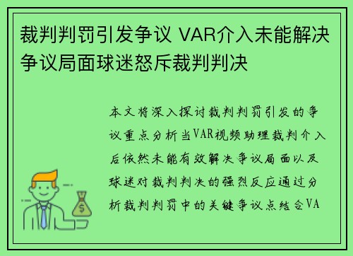 本文将深入探讨裁判判罚引发的争议,重点分析当VAR(视频助理裁判)介入后依然未能有效解决争议局面,以及球迷对裁判判决的强烈反应。通过分析裁判判罚中的关键争议点,结合VAR技术的应用和局限性,探讨这些争...