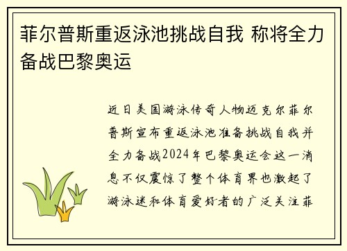 近日,美国游泳传奇人物迈克尔·菲尔普斯宣布重返泳池,准备挑战自我并全力备战2024年巴黎奥运会。这一消息不仅震惊了整个体育界,也激起了游泳迷和体育爱好者的广泛关注。菲尔普斯作为奥运历史上最成功的游泳运...