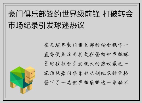 在足球界,豪门俱乐部的转会操作一直备受关注,尤其是在签约世界级球员时,往往会引发极大的热议。最近,一家顶级豪门俱乐部以创纪录的价格签下了一名世界级前锋,这一举动不仅打破了转会市场的纪录,也引发了球迷和...