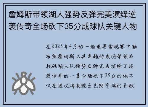 在2025年4月的一场重要常规赛中,勒布朗·詹姆斯以其卓越的表现带领洛杉矶湖人队强势反弹,完美演绎了逆袭传奇的一幕。全场砍下35分的他不仅在进攻端表现出色,防守端的贡献同样不容忽视。詹姆斯的全能表现成...