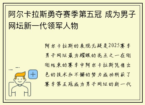 阿尔卡拉斯的表现无疑是2025赛季男子网坛最为耀眼的亮点之一。在刚刚结束的赛季中,阿尔卡拉斯凭借出色的技术和不懈的努力,成功斩获了赛季第五冠,成为男子网坛的新一代领军人物。本文将从四个方面详细探讨阿尔...
