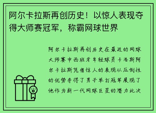 阿尔卡拉斯再创历史!在最近的网球大师赛中,西班牙年轻球员卡洛斯·阿尔卡拉斯凭借惊人的表现,以压倒性的优势夺得了男子单打冠军,展现了他作为新一代网球巨星的潜力。此次胜利不仅让他再次刷新了个人职业生涯的纪...