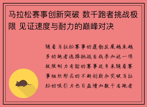 随着马拉松赛事的蓬勃发展,越来越多的跑者选择挑战自我,参加这一项极限耐力考验的赛事。近年来,随着赛事组织形式的不断创新和突破,马拉松的吸引力也日益增加。数千名跑者汇聚一堂,他们的目标不仅是完成全程42...