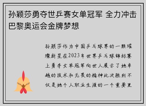 孙颖莎作为中国乒乓球界的一颗璀璨新星,在2023年世界乒乓球锦标赛上勇夺女单冠军,向世人展示了她卓越的技术和无畏的精神。此次胜利不仅是她个人职业生涯的一个重要里程碑,也是中国乒乓球运动的辉煌成就之一。...