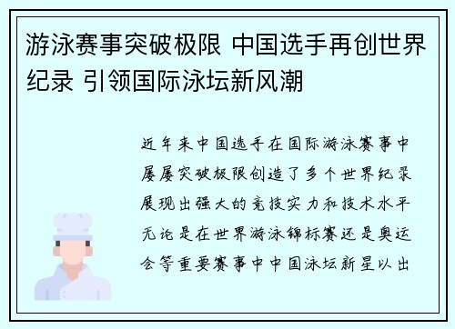 近年来,中国选手在国际游泳赛事中屡屡突破极限,创造了多个世界纪录,展现出强大的竞技实力和技术水平。无论是在世界游泳锦标赛还是奥运会等重要赛事中,中国泳坛新星以出色的表现赢得了世界的瞩目。在这些选手的带...