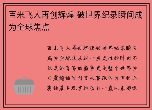 百米飞人再创辉煌,破世界纪录瞬间成为全球焦点,这一历史性的时刻不仅是体育界的盛事,更是整个世界为之震撼的时刻。百米赛跑作为田径比赛的最具观赏性项目,一直以来都吸引着全世界的目光。而当一位选手以破纪录的...