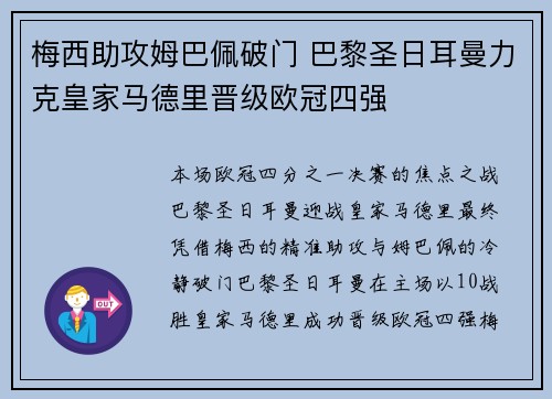 本场欧冠四分之一决赛的焦点之战,巴黎圣日耳曼迎战皇家马德里,最终凭借梅西的精准助攻与姆巴佩的冷静破门,巴黎圣日耳曼在主场以1-0战胜皇家马德里,成功晋级欧冠四强。梅西的传球如同艺术品般精准,姆巴佩的进...