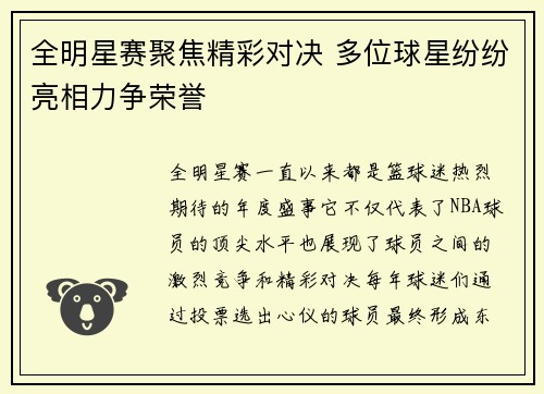 全明星赛一直以来都是篮球迷热烈期待的年度盛事,它不仅代表了NBA球员的顶尖水平,也展现了球员之间的激烈竞争和精彩对决。每年,球迷们通过投票选出心仪的球员,最终形成东部和西部的明星阵容。而在这个舞台上,...