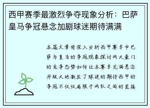 本篇文章将深入分析西甲赛季中巴萨与皇马的争冠现象,探讨两大豪门的竞争态势如何让本赛季充满悬念,并极大地激发了球迷的期待。西甲的争冠不仅仅局限于两队之间的直接较量,还涉及到了两队背后深厚的历史底蕴、强大...