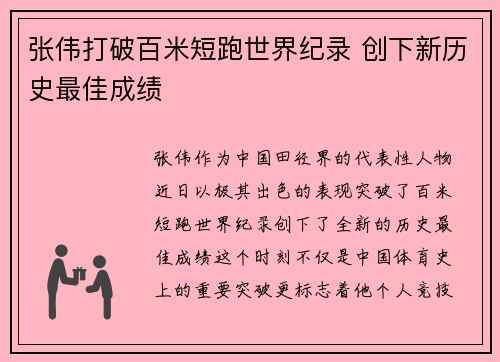 张伟,作为中国田径界的代表性人物,近日以极其出色的表现突破了百米短跑世界纪录,创下了全新的历史最佳成绩。这个时刻不仅是中国体育史上的重要突破,更标志着他个人竞技生涯的巅峰时刻。本文将从张伟的训练背景、...