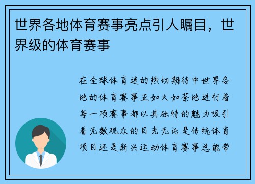 在全球体育迷的热切期待中,世界各地的体育赛事正如火如荼地进行着,每一项赛事都以其独特的魅力吸引着无数观众的目光。无论是传统体育项目还是新兴运动,体育赛事总能带来无尽的激情与感动。 欧洲大陆无疑是全球体...