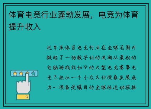 近年来,体育电竞行业在全球范围内掀起了一场数字化的浪潮。从最初的电脑游戏到如今的大型电竞赛事,电竞已经从一个小众文化现象发展成为一项备受瞩目的全球性运动。根据相关数据显示,全球电竞用户数量已超过5亿,...