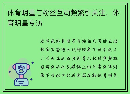 近年来,体育明星与粉丝之间的互动频率显著增加,这种现象不仅引发了广泛关注,还成为体育文化的重要组成部分。从社交媒体上的日常分享到线下活动中的近距离接触,体育明星们通过各种方式与粉丝建立起了深厚的情感连...