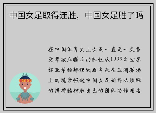 在中国体育史上,女足一直是一支备受尊敬和瞩目的队伍。从1999年世界杯亚军的辉煌,到近年来在亚洲赛场上的稳步崛起,中国女足始终以顽强的拼搏精神和出色的团队协作闻名于世。而最近,中国女足再次迎来了一波令...