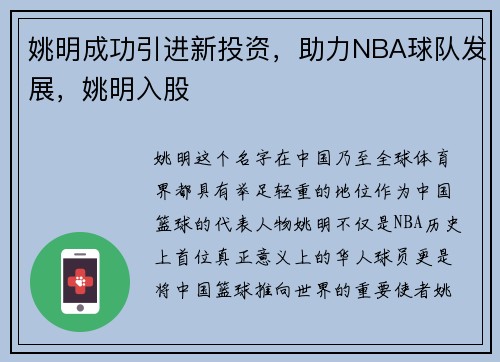 姚明,这个名字在中国乃至全球体育界都具有举足轻重的地位。作为中国篮球的代表人物,姚明不仅是NBA历史上首位真正意义上的华人球员,更是将中国篮球推向世界的重要使者。姚明的职业生涯并不仅仅局限于球员身份。...