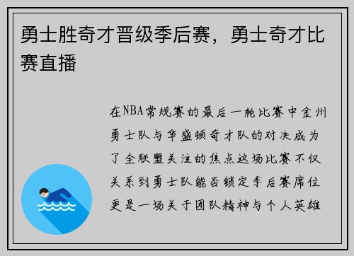 在NBA常规赛的最后一轮比赛中,金州勇士队与华盛顿奇才队的对决成为了全联盟关注的焦点。这场比赛不仅关系到勇士队能否锁定季后赛席位,更是一场关于团队精神与个人英雄主义的完美诠释。最终,勇士队以120比1...