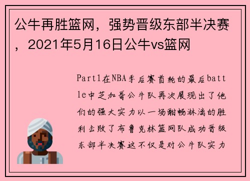 Part1 在NBA季后赛首轮的最后battle中,芝加哥公牛队再次展现出了他们的强大实力,以一场酣畅淋漓的胜利击败了布鲁克林篮网队,成功晋级东部半决赛。这不仅是对公牛队实力的认可,更是他们本赛季以来...