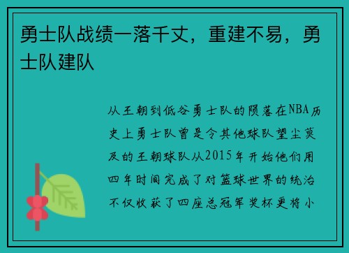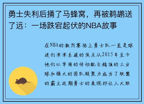 在NBA的激烈赛场上,勇士队一直是球迷们津津乐道的焦点。从2015年至今,他们以华丽的传切配合、精准的三分球和强大的团队凝聚力,成为了联盟的霸主。近期勇士的表现却让人大跌眼镜,他们在一场关键战役中意外...