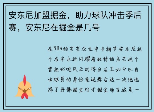 在NBA的芸芸众生中,卡梅罗·安东尼这个名字永远闪耀着独特的光芒。这个曾经叱咤风云的得分后卫,如今以自由球员的身份重返舞台,这一次,他选择了丹佛掘金。对于掘金而言,这是一个激动人心的决定,也是球队冲击...