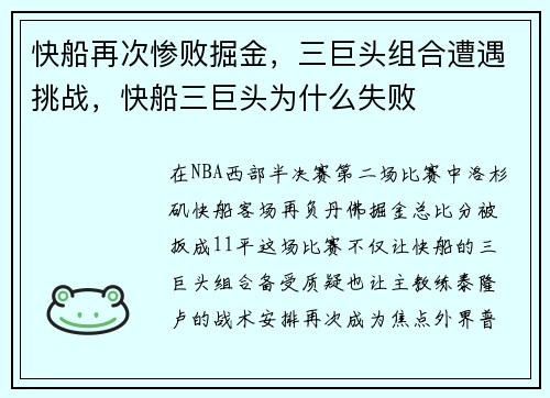 在NBA西部半决赛第二场比赛中,洛杉矶快船客场再负丹佛掘金,总比分被扳成1-1平。这场比赛不仅让快船的三巨头组合备受质疑,也让主教练泰隆·卢的战术安排再次成为焦点。外界普遍认为,快船在阵容磨合、战术执...