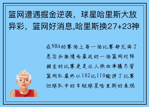 在NBA的赛场上,每一场比赛都充满了悬念和激情,而最近的一场篮网对阵掘金的比赛更是让人热血沸腾。尽管篮网队最终以102比110输掉了比赛,但球队中的年轻球星哈里斯的表现却成为了全场的亮点。这场比赛不仅...