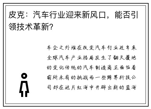 车企之外,谁在改变汽车行业? 近年来,全球汽车产业格局发生了翻天覆地的变化。传统的汽车制造商正面临着前所未有的挑战,而一些跨界科技公司却在这片红海中开辟出新的蓝海。从埃隆·马斯克的特斯拉到中国的科技巨...
