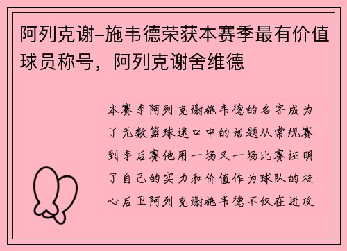 本赛季,阿列克谢-施韦德的名字成为了无数篮球迷口中的话题。从常规赛到季后赛,他用一场又一场比赛证明了自己的实力和价值。作为球队的核心后卫,阿列克谢-施韦德不仅在进攻端展现了强大的得分能力,更在防守端贡...