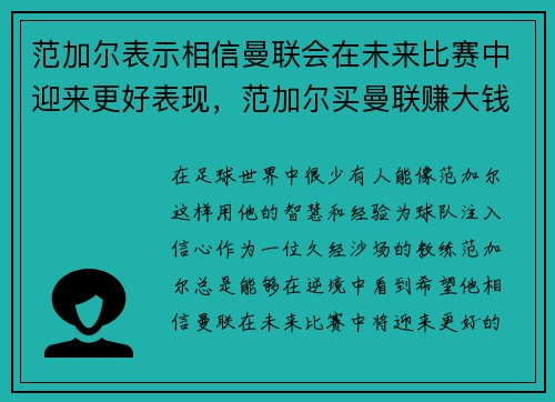在足球世界中,很少有人能像范加尔这样,用他的智慧和经验为球队注入信心。作为一位久经沙场的教练,范加尔总是能够在逆境中看到希望,他相信曼联在未来比赛中将迎来更好的表现。这种信念不仅仅是对球队实力的认可,...
