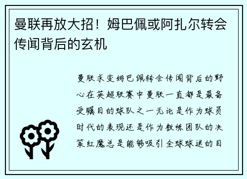 曼联求变,姆巴佩转会传闻背后的野心 在英超联赛中,曼联一直都是最备受瞩目的球队之一。无论是作为球员时代的表现,还是作为教练团队的决策,红魔总是能够吸引全球球迷的目光。而最近,关于曼联有意邀请姆巴佩的传...