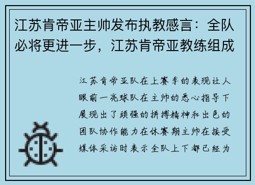 江苏肯帝亚队在上赛季的表现让人眼前一亮,球队在主帅的悉心指导下,展现出了顽强的拼搏精神和出色的团队协作能力。在休赛期,主帅在接受媒体采访时表示,全队上下都已经为新赛季做好了充分的准备。他提到,上赛季虽...