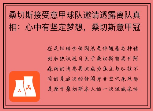 在足坛,转会传闻总是伴随着各种猜测和热议。近日,关于桑切斯将离开阿森纳的消息再次成为焦点。与以往不同的是,这次的传闻并非空穴来风,而是源于桑切斯本人的一次坦诚采访。在采访中,桑切斯不仅证实了自己确实收...