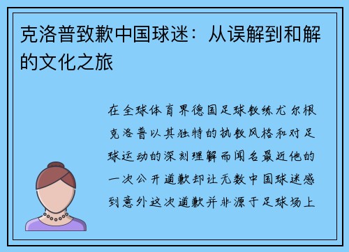 在全球体育界,德国足球教练尤尔根·克洛普以其独特的执教风格和对足球运动的深刻理解而闻名。最近他的一次公开道歉却让无数中国球迷感到意外。这次道歉并非源于足球场上的争议,而是源于他对中文学习和中国文化的误...