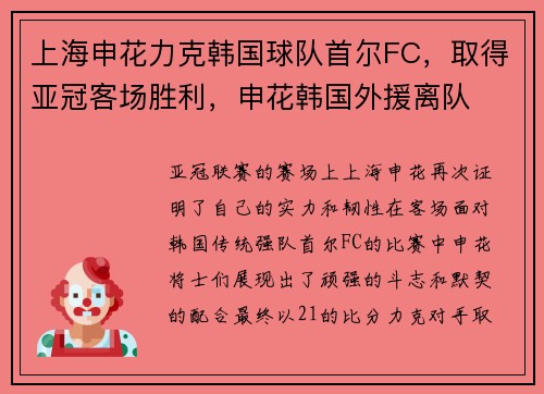 亚冠联赛的赛场上,上海申花再次证明了自己的实力和韧性。在客场面对韩国传统强队首尔FC的比赛中,申花将士们展现出了顽强的斗志和默契的配合,最终以2-1的比分力克对手,取得了宝贵的三分。这场比赛不仅是申花...