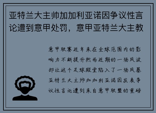 意甲联赛近年来在全球范围内的影响力不断提升,然而近期的一场风波却让这个足球殿堂陷入了一场“风暴”。亚特兰大主帅加加利亚诺因发表争议性言论,遭到来自意甲联盟的重磅处罚,这一事件不仅引发了球迷的热议,也让...