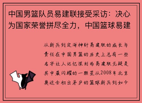 从“新兵”到“定海神针”,易建联的成长与责任 在中国男篮的历史上,总有一些名字让人记忆深刻,而易建联无疑是其中最闪耀的一颗星。从2008年北京奥运会初出茅庐的“篮球新兵”,到如今国际赛场上备受瞩目的“...