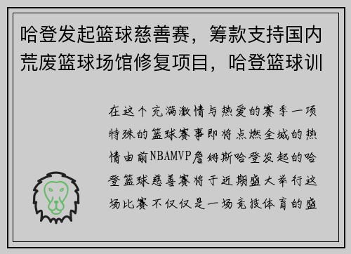 在这个充满激情与热爱的赛季,一项特殊的篮球赛事即将点燃全城的热情。由前NBAMVP詹姆斯·哈登发起的“哈登篮球慈善赛”将于近期盛大举行,这场比赛不仅仅是一场竞技体育的盛宴,更是一场汇聚爱心的公益活动。...